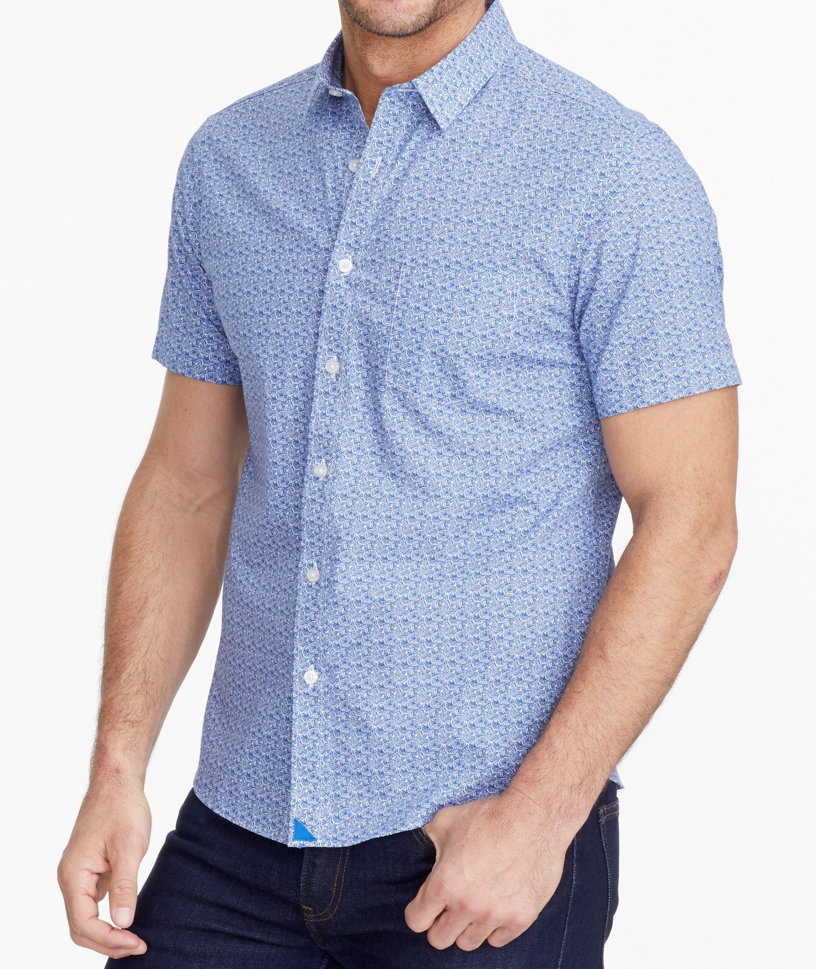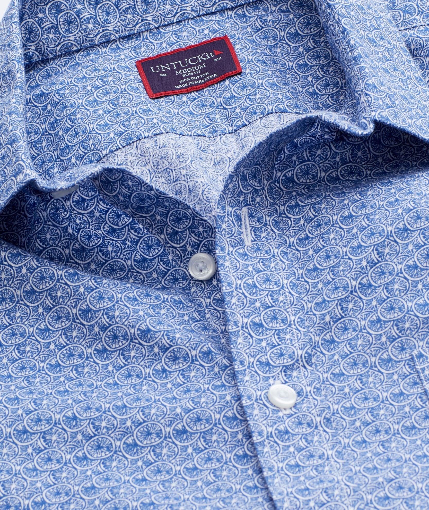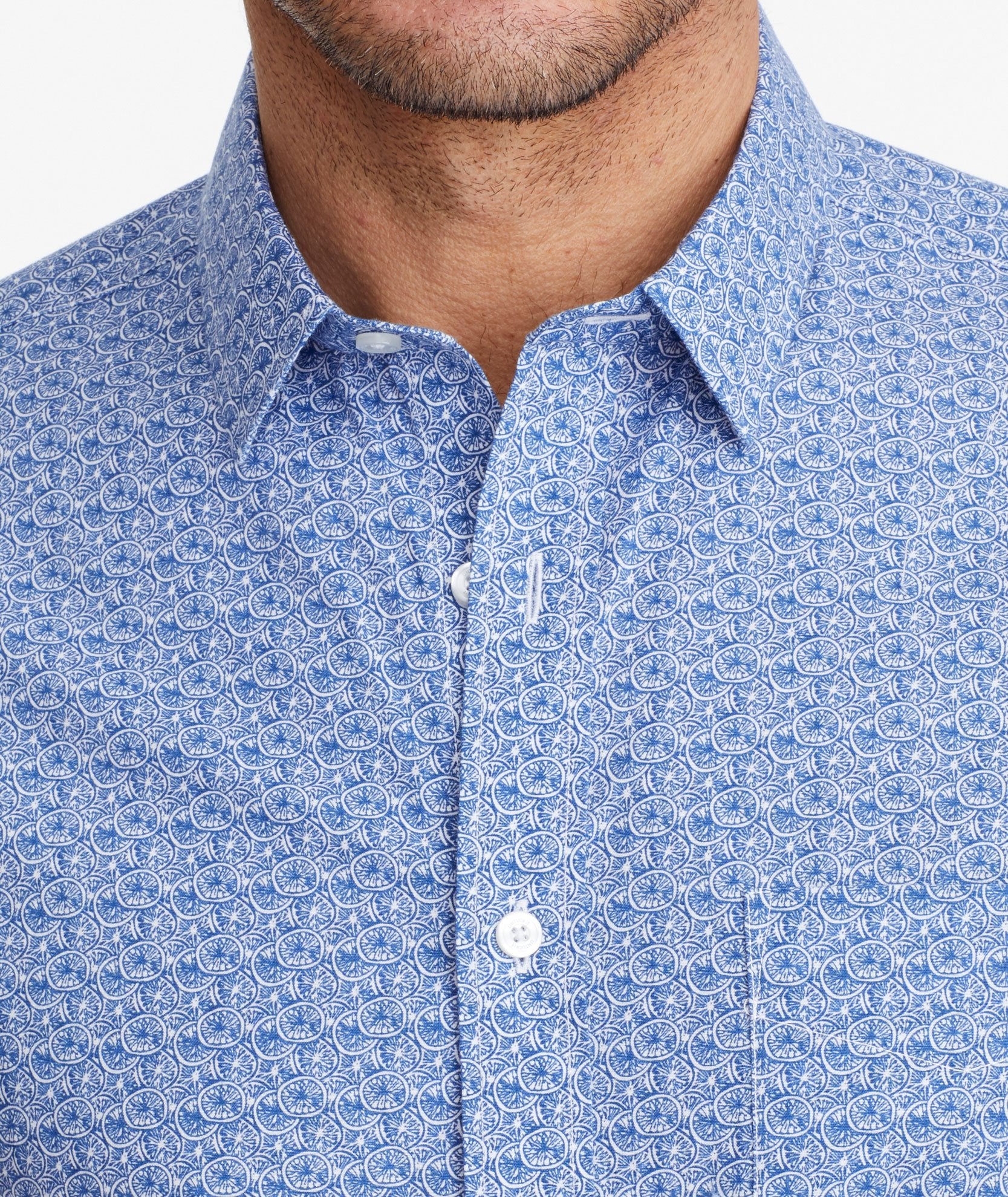 The perfect short-sleeve button-down is a warm-weather essential. Our 100% cotton Tavira Shirt boasts a navy grapefruit print that'll put you in a sweet state of mind—and it has our signature untucked length. Pair it with our Cotton-Linen Shorts for a truly breezy vibe.